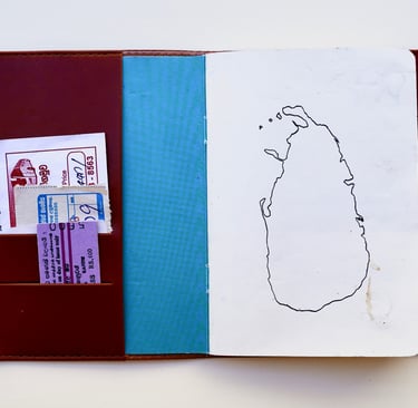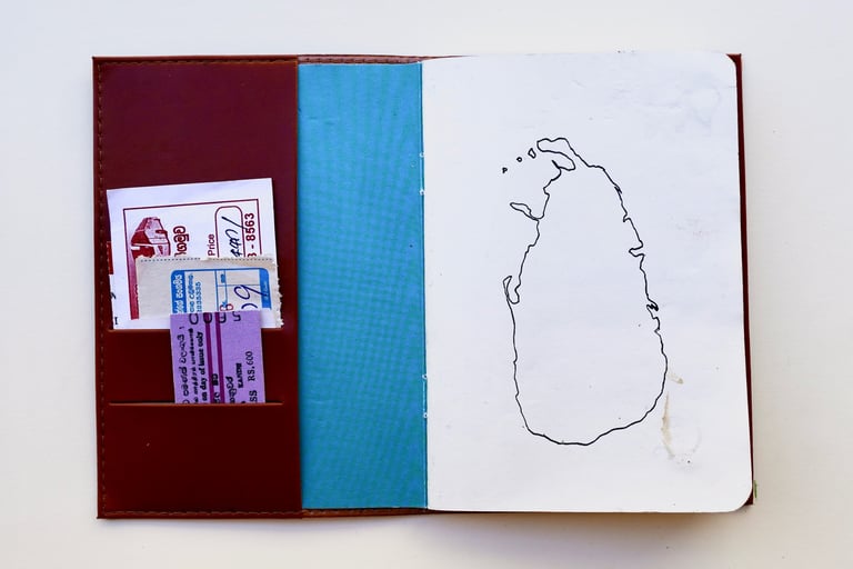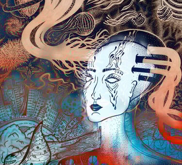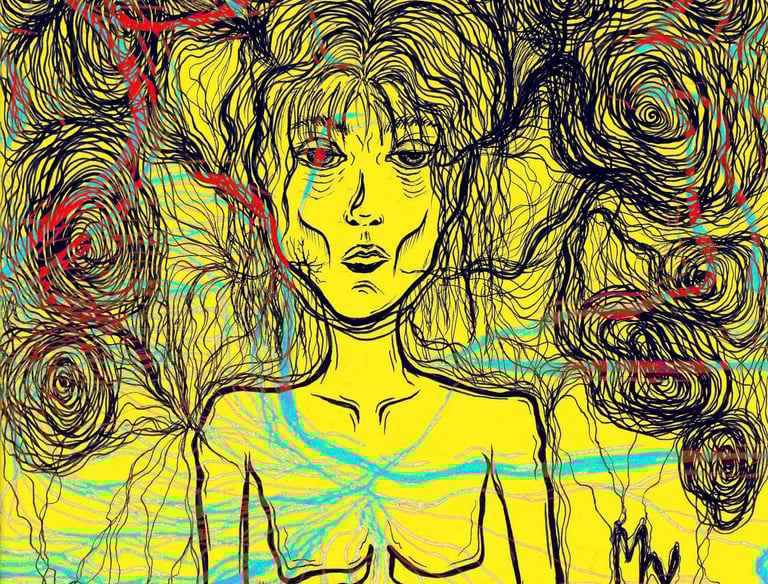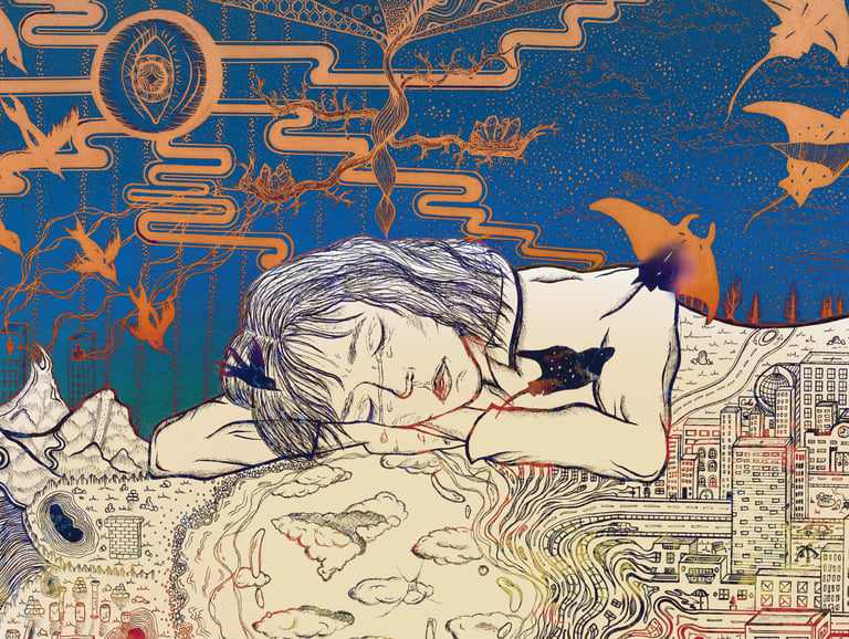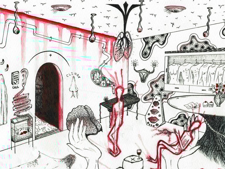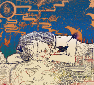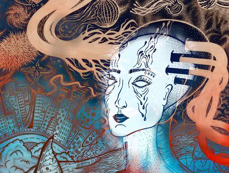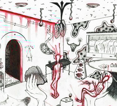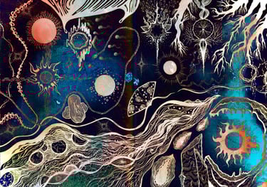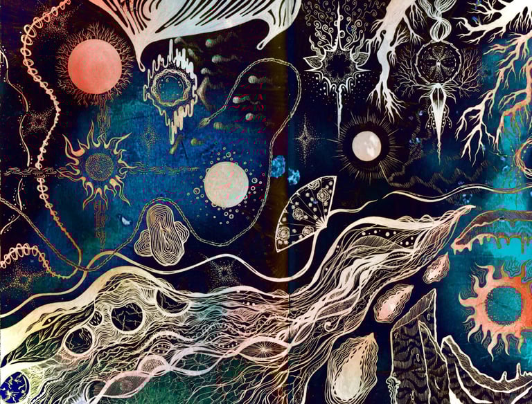 Handmade black-and-white drawings colored with digital photography and watercolor.